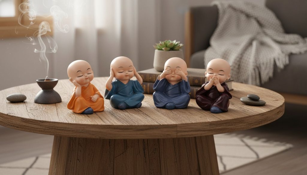Decor plays a vital role in creating a calm environment. Therefore, choosing meaningful decor enhances both beauty and energy. The TIED RIBBONS miniature Buddha monk statues offer elegance and spiritual charm. Moreover, this set of four statues brings peace and positivity to any space.